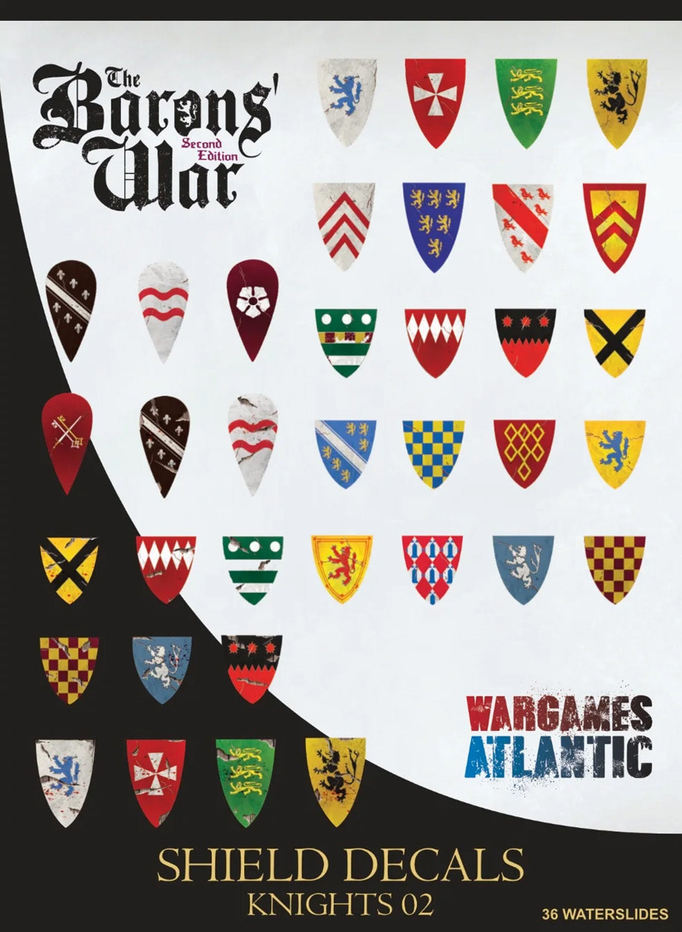 This box includes 36 shield decals with 24 unique designs and 12 battle-damaged versions. Designs based on prominent heraldry of the period, including for Hubert de Burgh, William Longespée, William de Warenne, Peter des Roches, Faulkes de Breauté, King Alexander II of Scotland, Thomas, count of Perche, among others. Pre-cut for ease of use, these decals can be applied directly to our plastic shields.