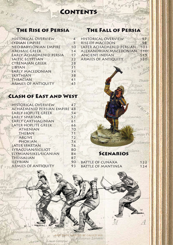 The second part charts the Greek and Persian Wars throughout the Mediterranean. Army lists featured in the section include: Achaemenid Persian Empire, Early Hoplite Greek, Early Spartan, Early Carthaginian, Later Hoplite Greek (including Athenian, Argive, Theban and Phokian), Later Spartan, Syracusan/Siciliot, Elymian/Sikel/Sicanian, Thessalian and Illyrian.